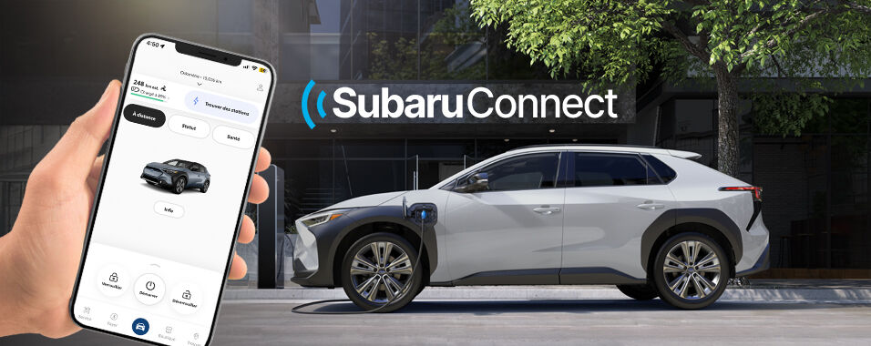 Les propriétaires de Solterra utilisent l’appli SubaruConnectMC, disponible à partir des boutiques d’applis Apple et Google. L’appli SubaruConnectMC s’applique exclusivement à la Solterra. Pour les autres modèles Subaru, il convient d’utiliser l’appli MySubaru.